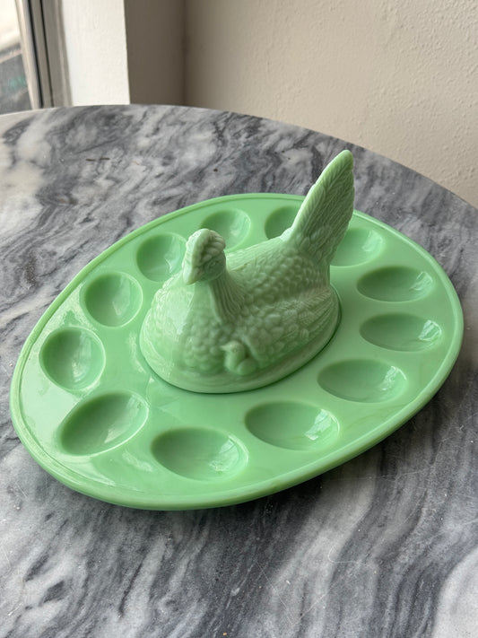 Vintage Jadeite Hen on Nest Egg Tray - L.E. Smith Glass - Deviled Egg Plate - Mid-Century Kitchenware