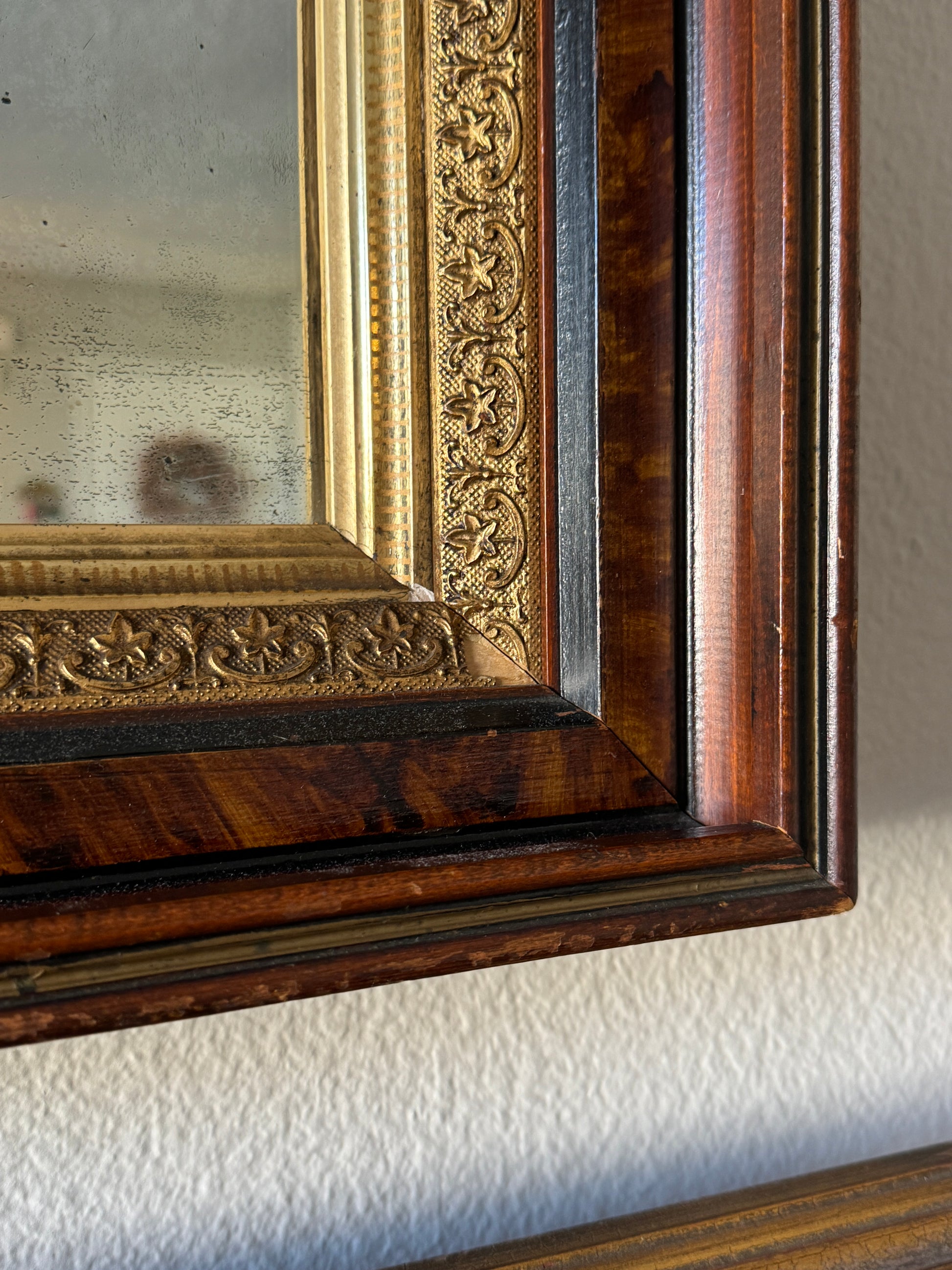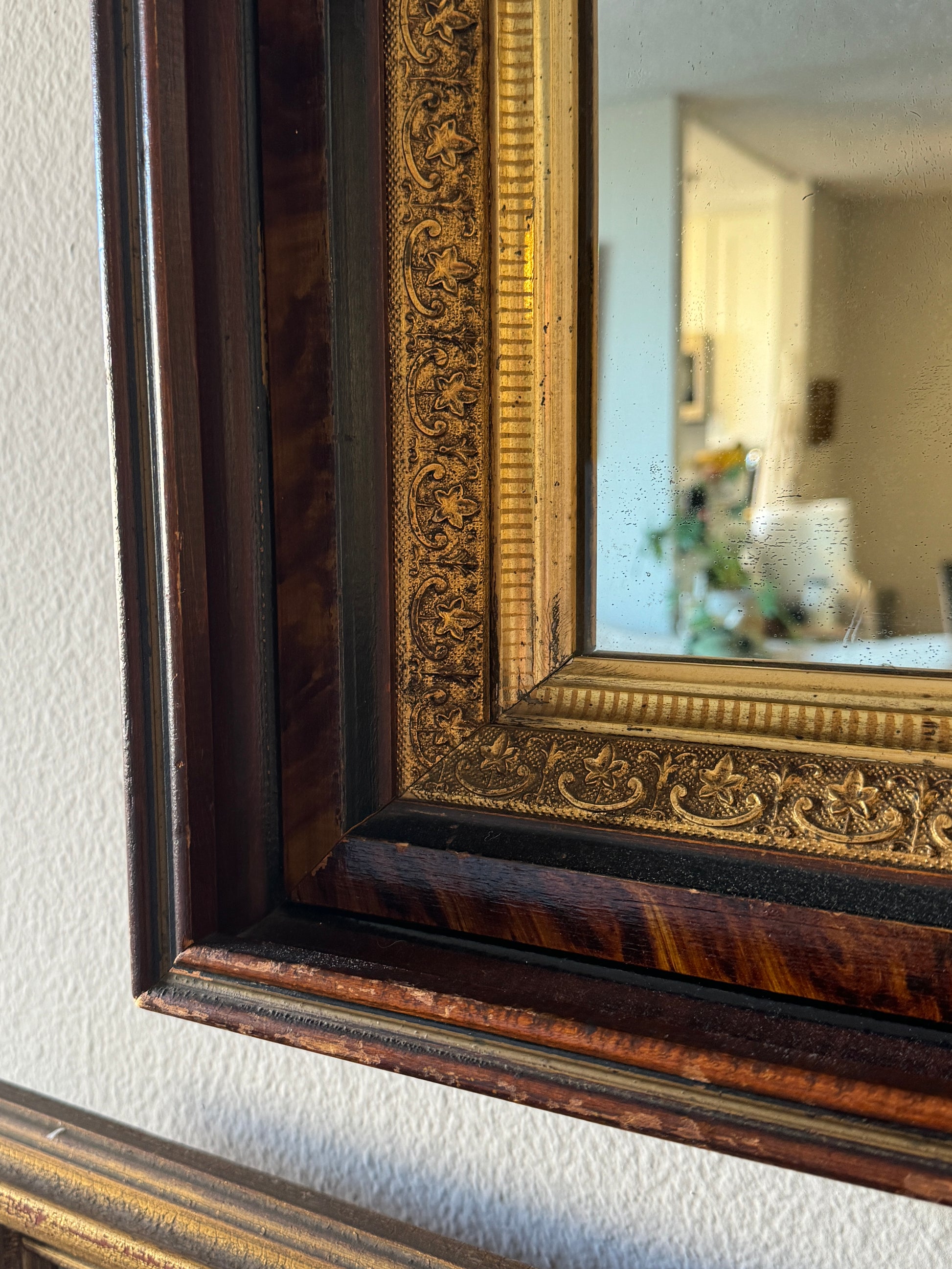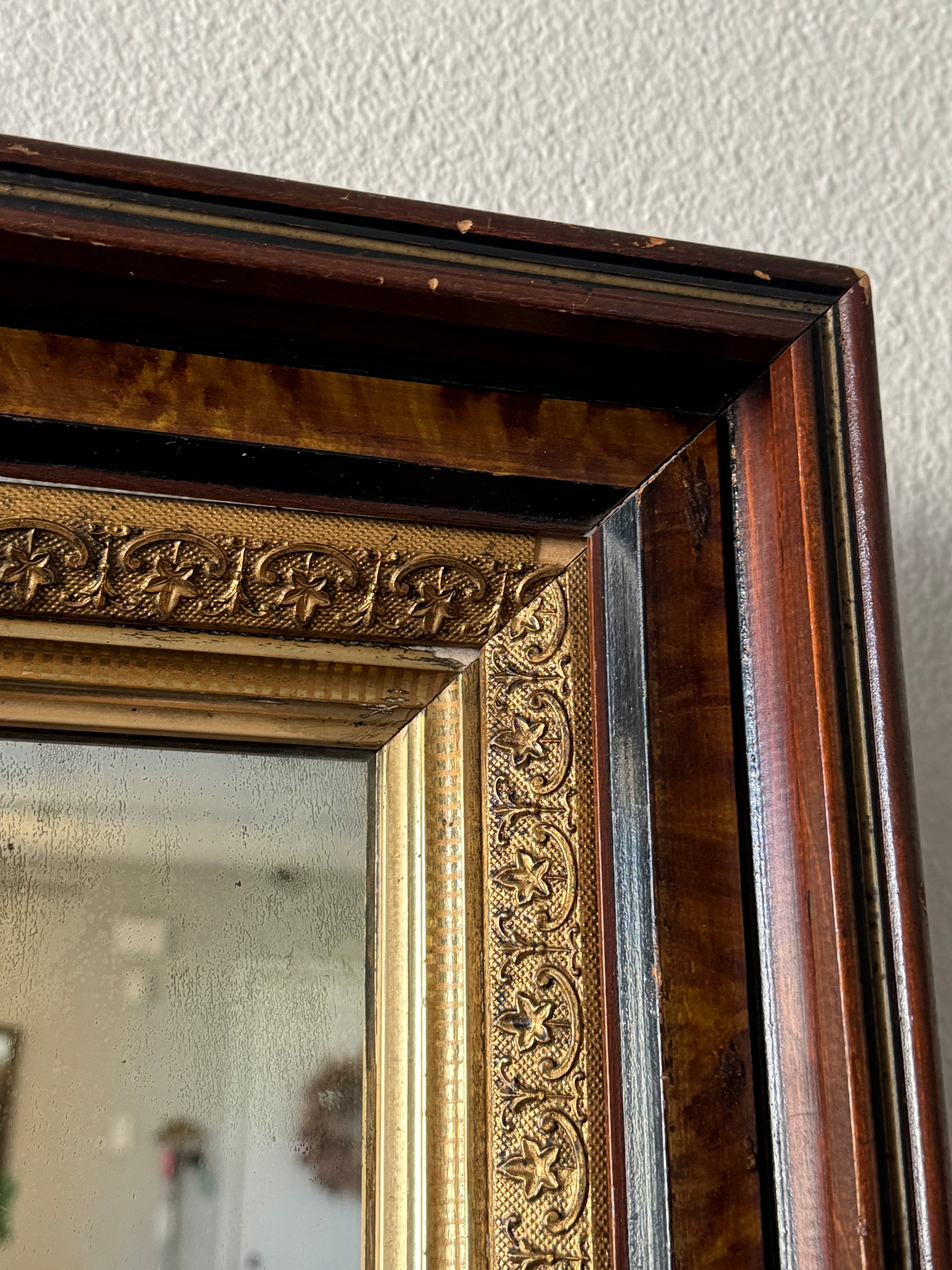Antique Victorian-era shadow-box style mirror with four layers of different wood/ textures from burlwood to gold leaf gilding. Beautiful! Has the original mirror which gives the glass a smoky, antique look. Great as an accent piece or as part of a gallery wall.