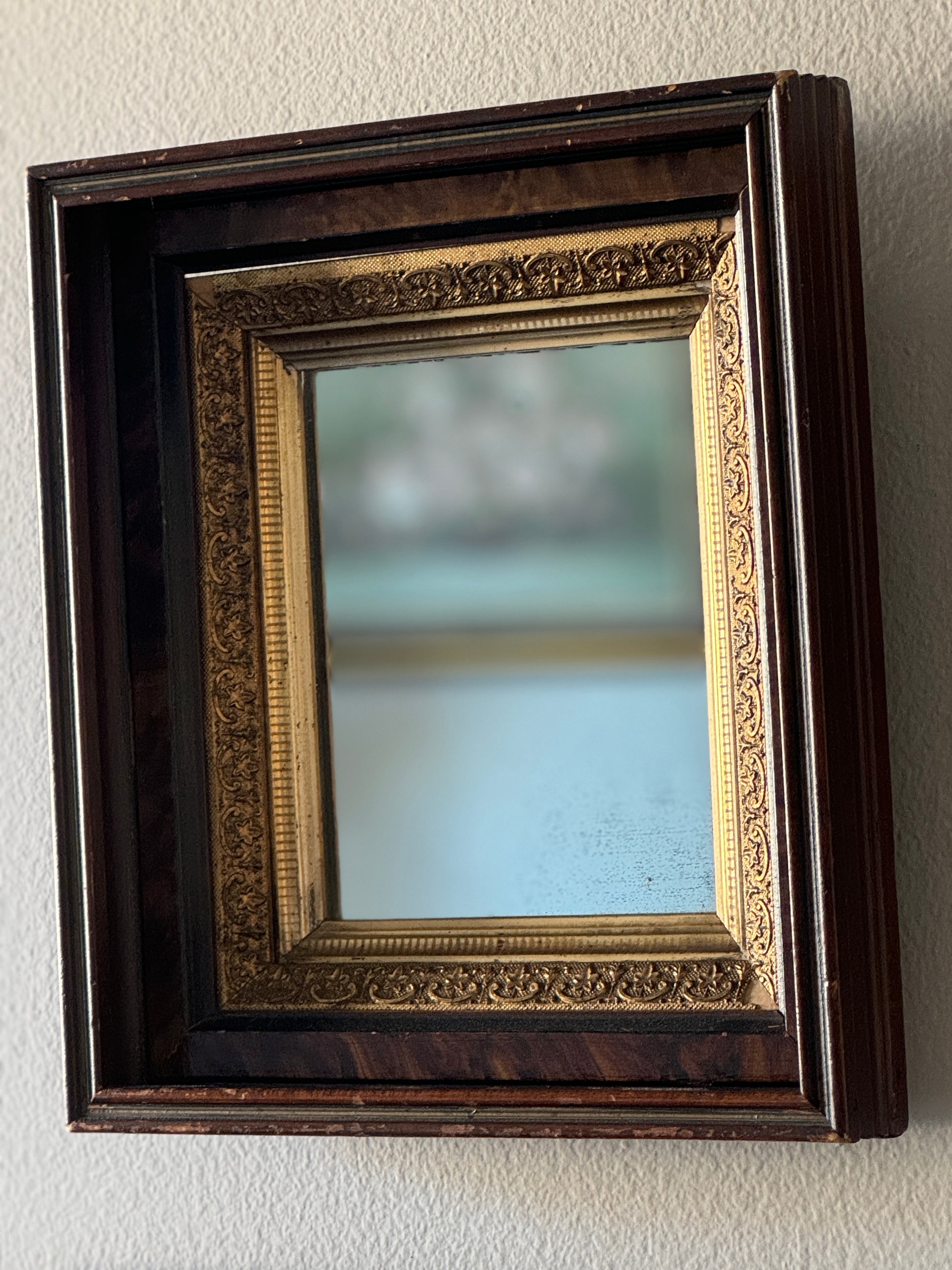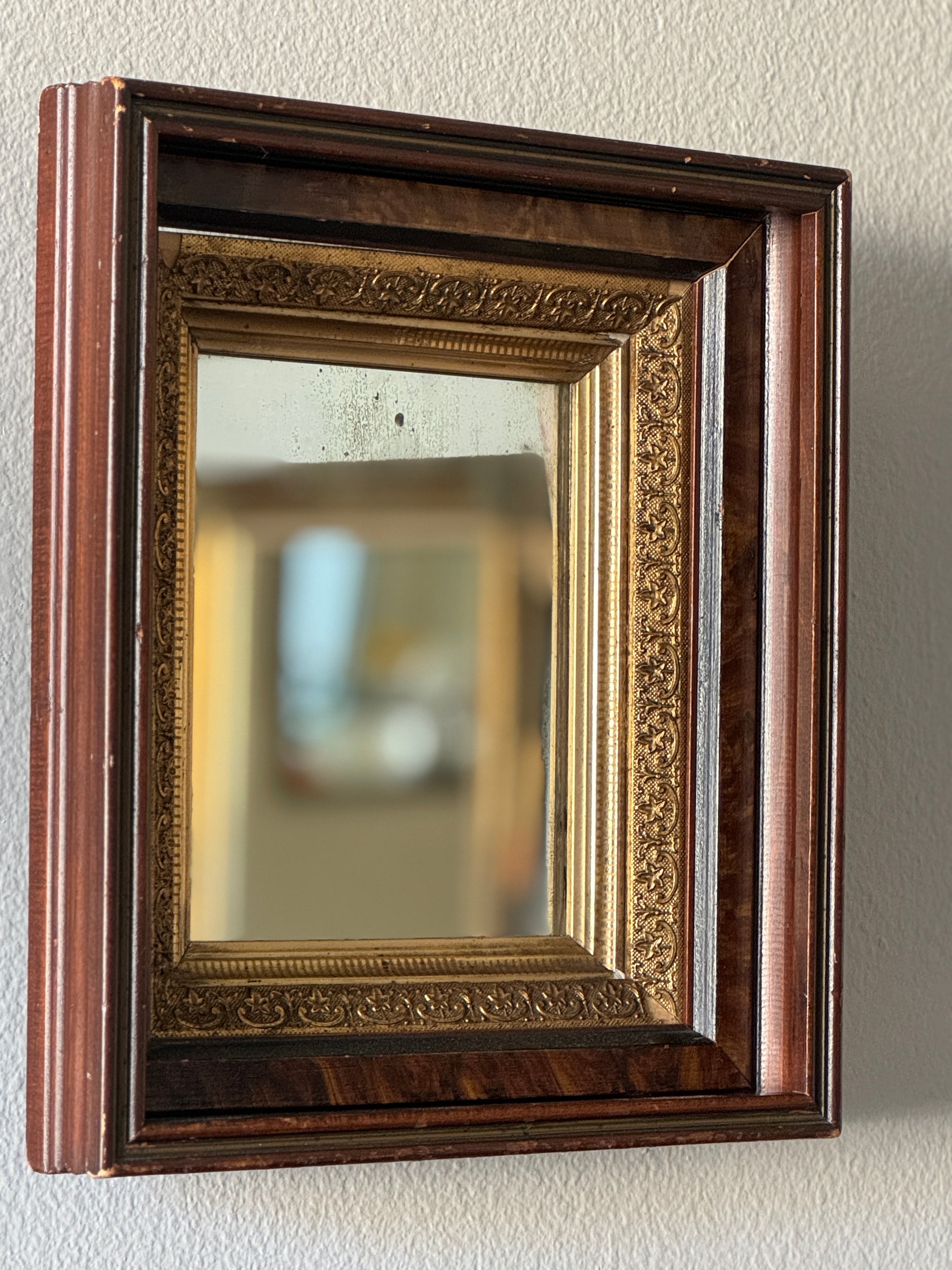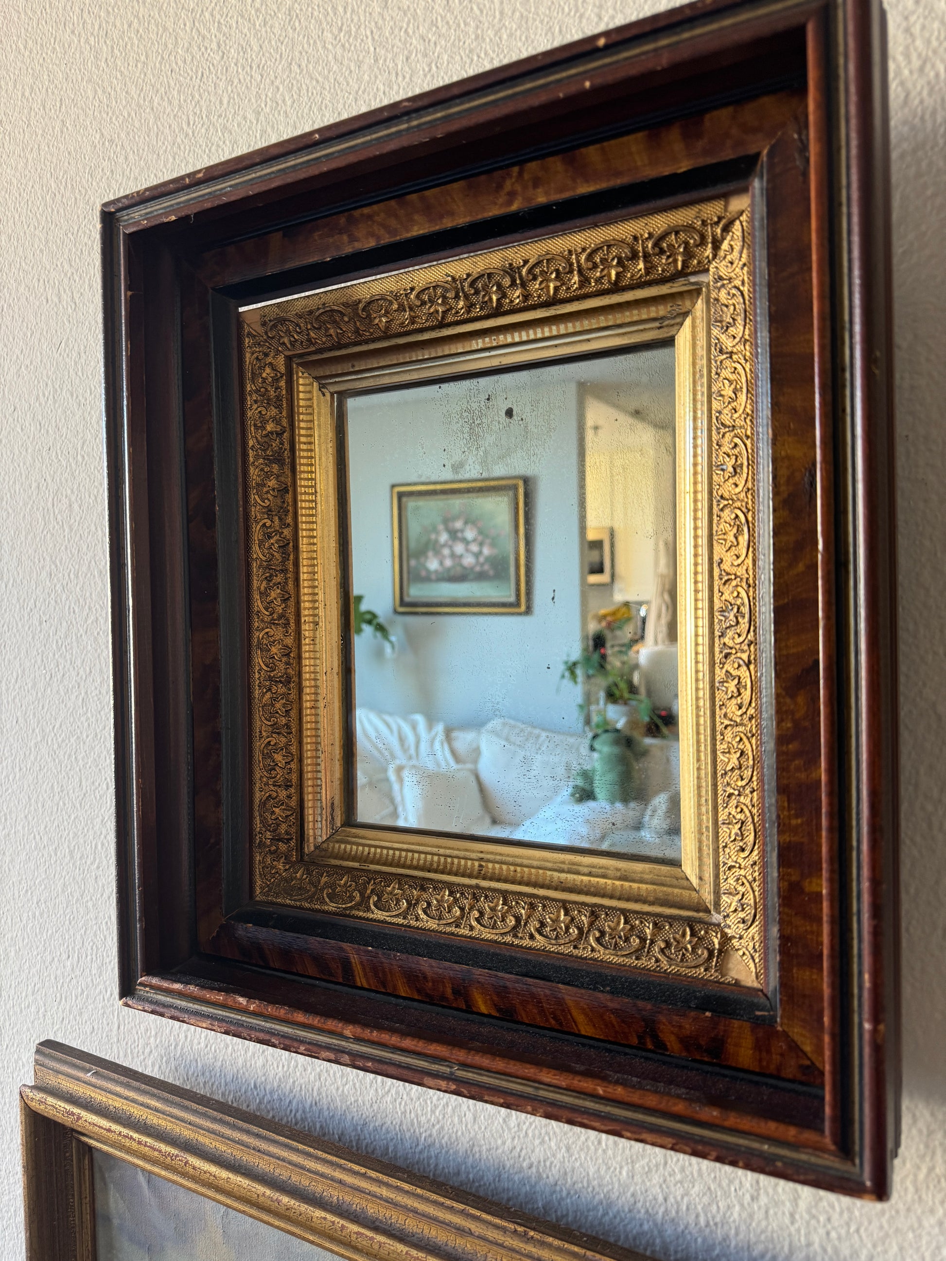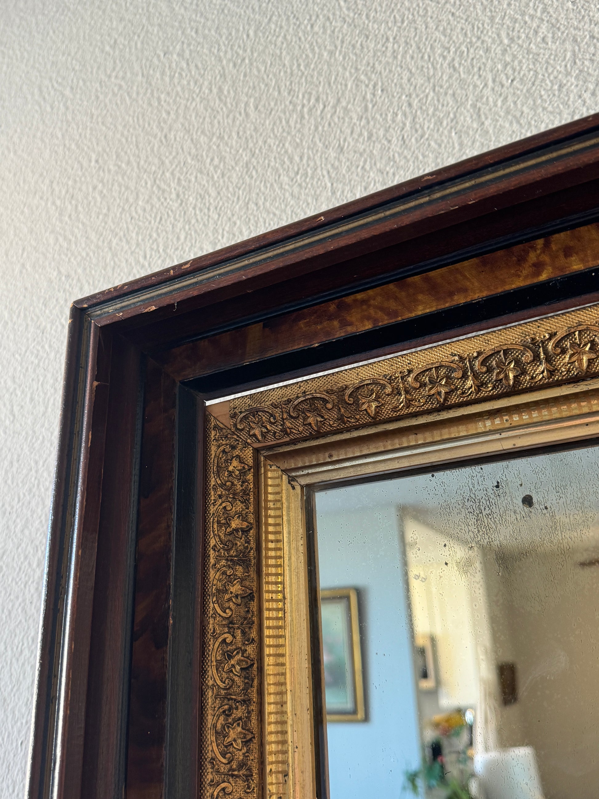 Antique Victorian-era shadow-box style mirror with four layers of different wood/ textures from burlwood to gold leaf gilding. Beautiful! Has the original mirror which gives the glass a smoky, antique look. Great as an accent piece or as part of a gallery wall.