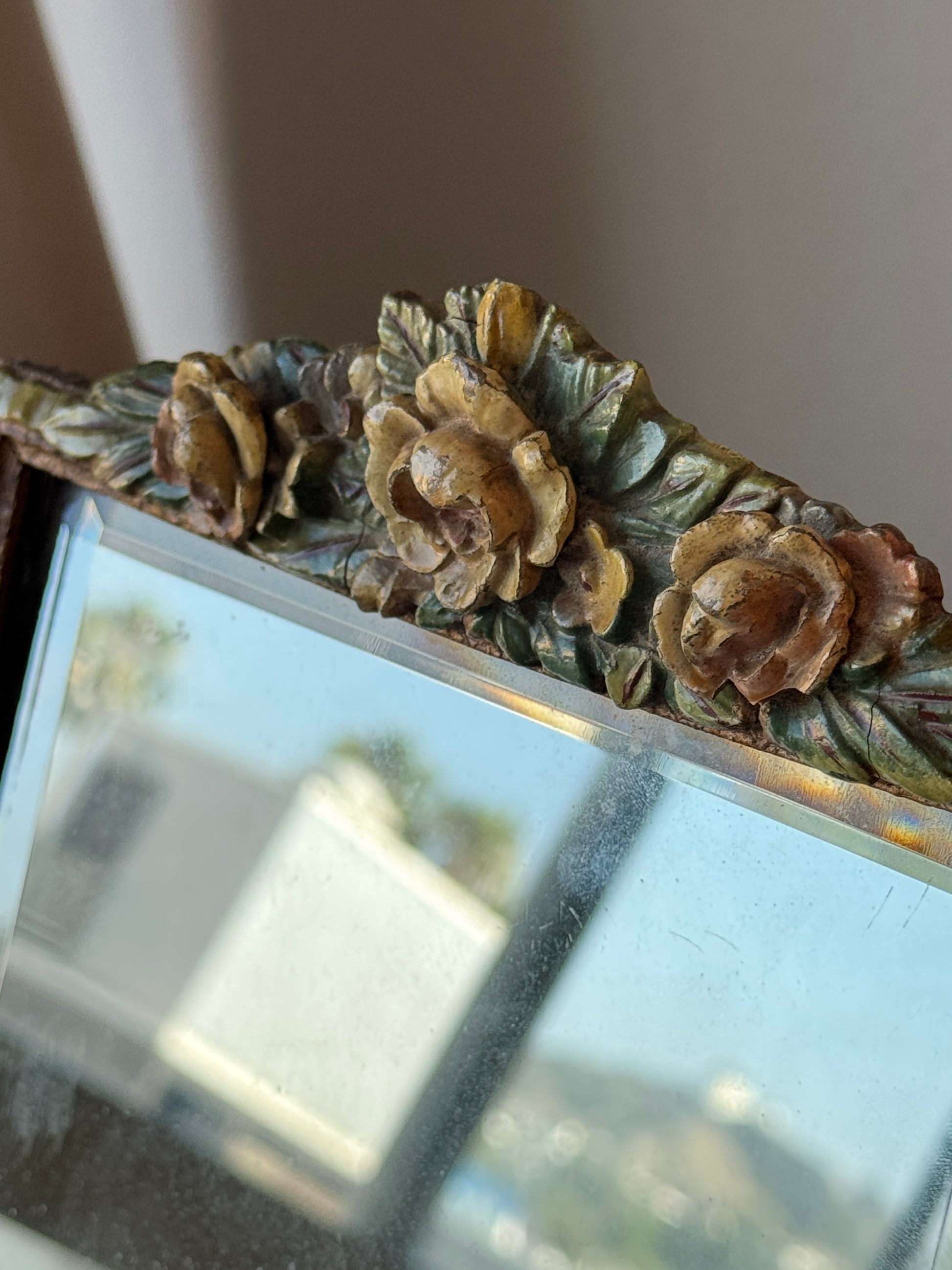 Excellent vintage condition. Some natural aging to the floral crest and mirror, consistent with age. No cracks or breaks. Mirror surface shows minor silvering, adding to the vintage character.