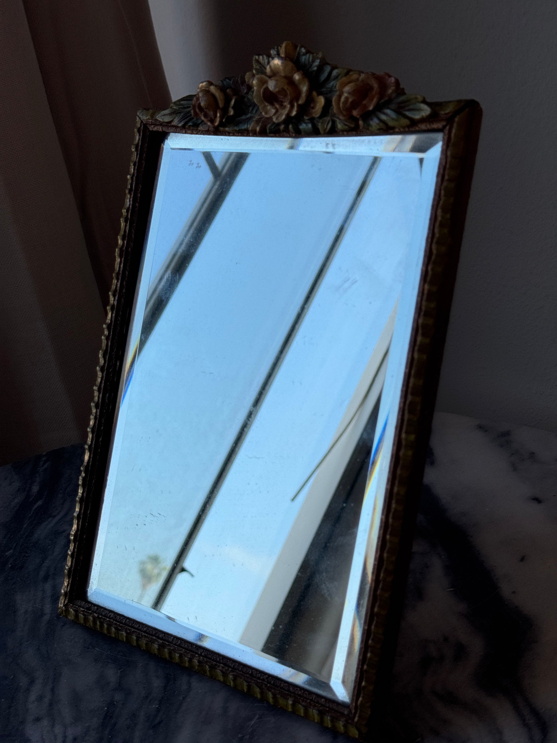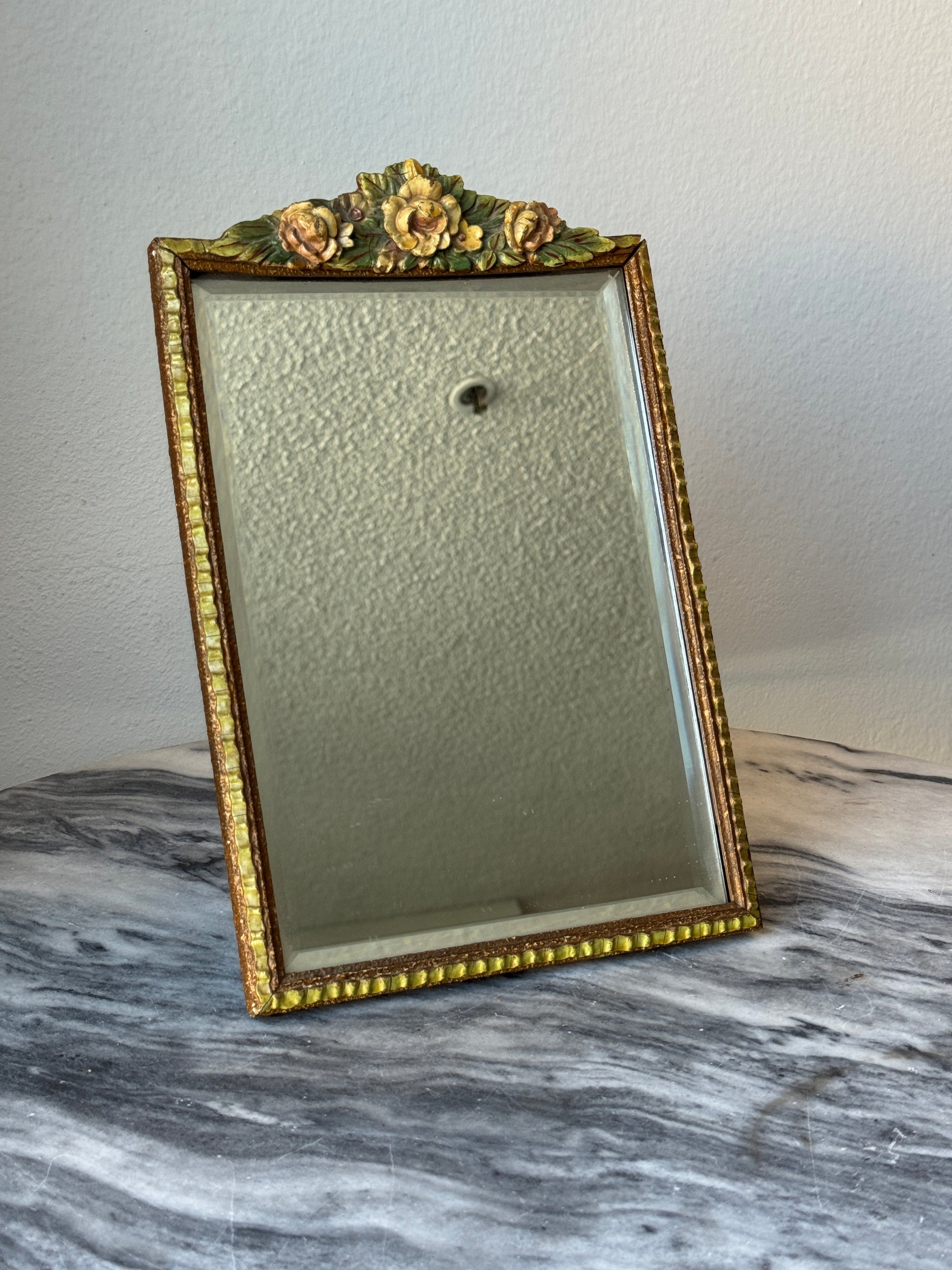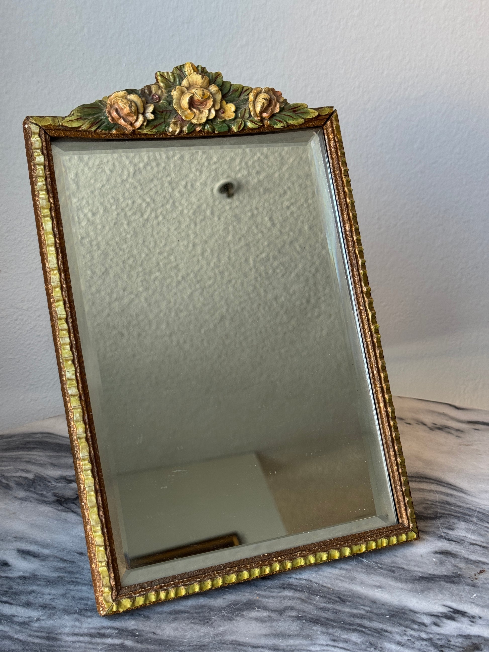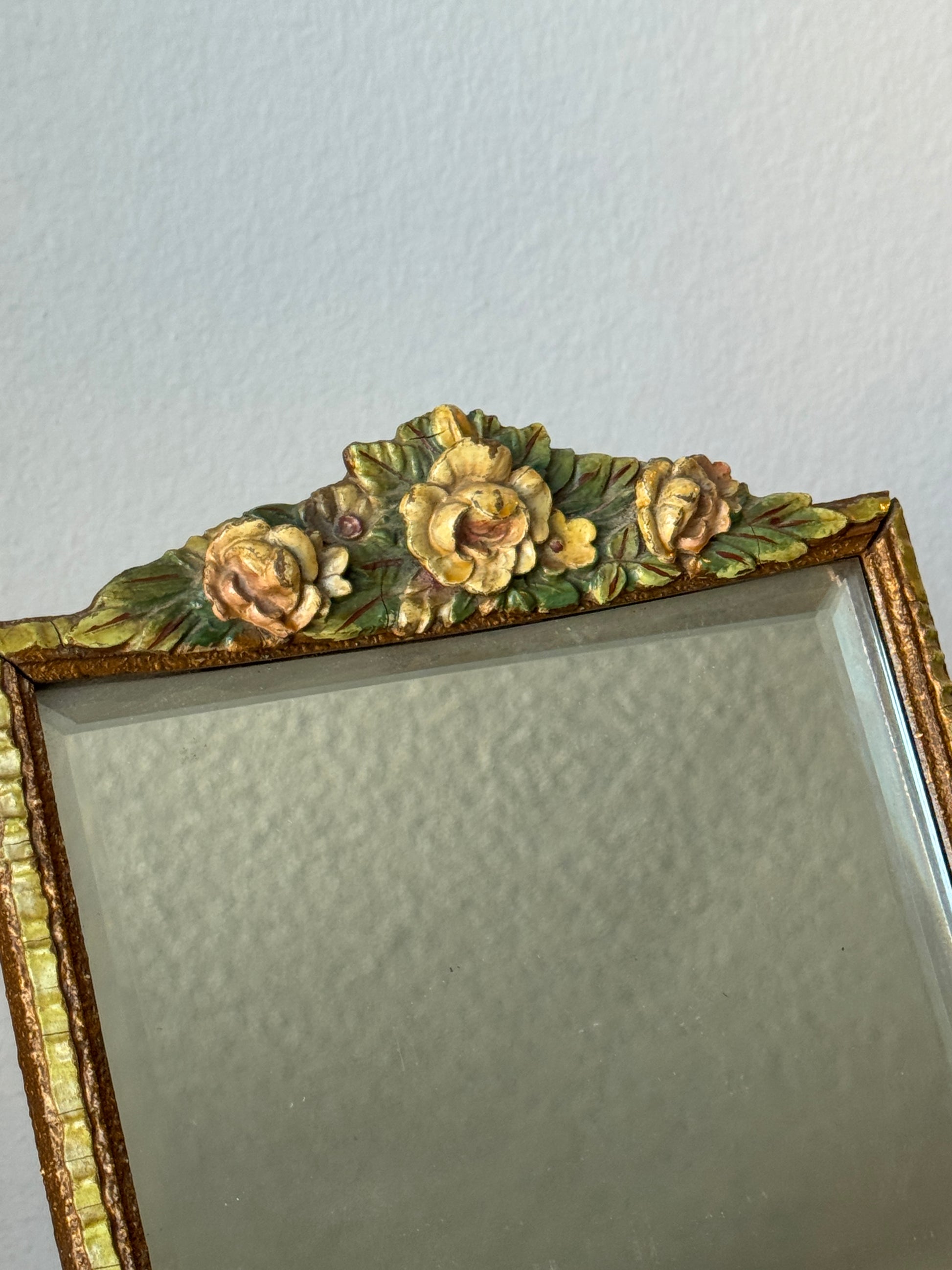 Vintage vanity mirror, rectangular floral mirror, 1930s mirror, hand-painted gesso mirror, Hollywood regency mirror, romantic boudoir decor, antique-style mirror, Art Deco tabletop mirror, shabby chic vanity, cottagecore decor