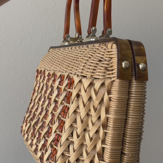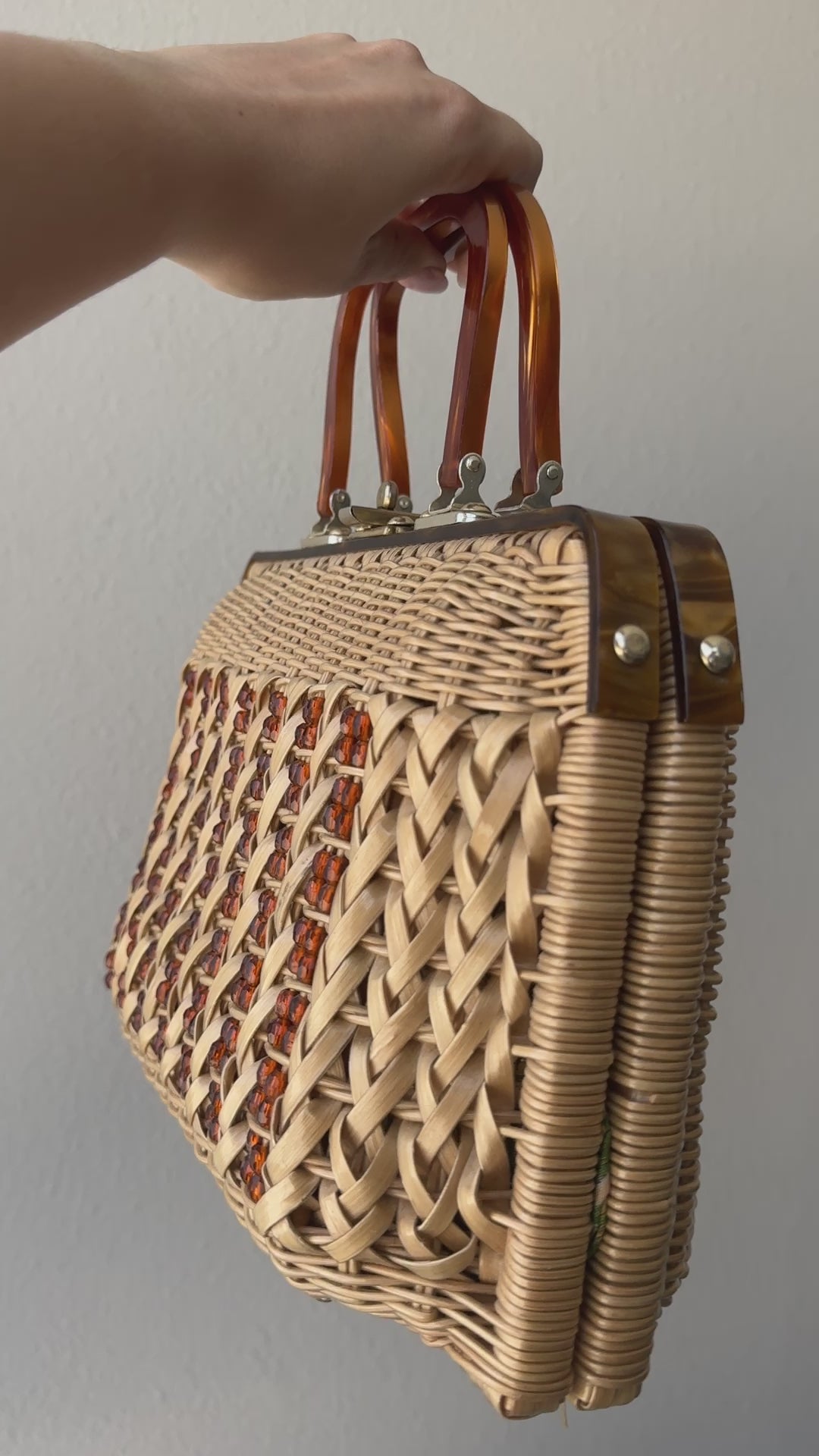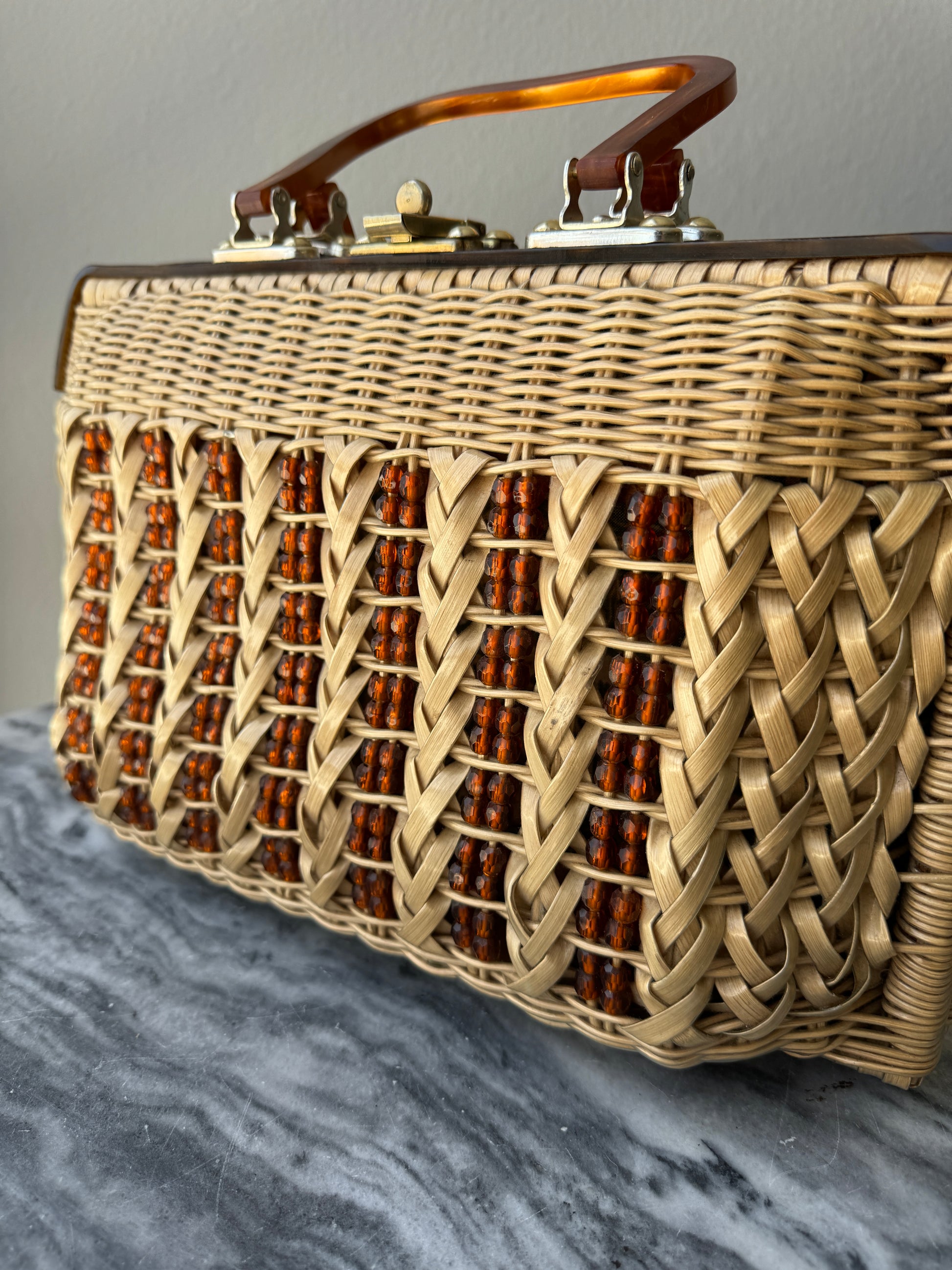 Vintage wicker handbag with beads and lucite handles. Super cute summer bag I enjoyed all last year! So roomy and cute interior fabric. Some tears to fabric. But so great overall!