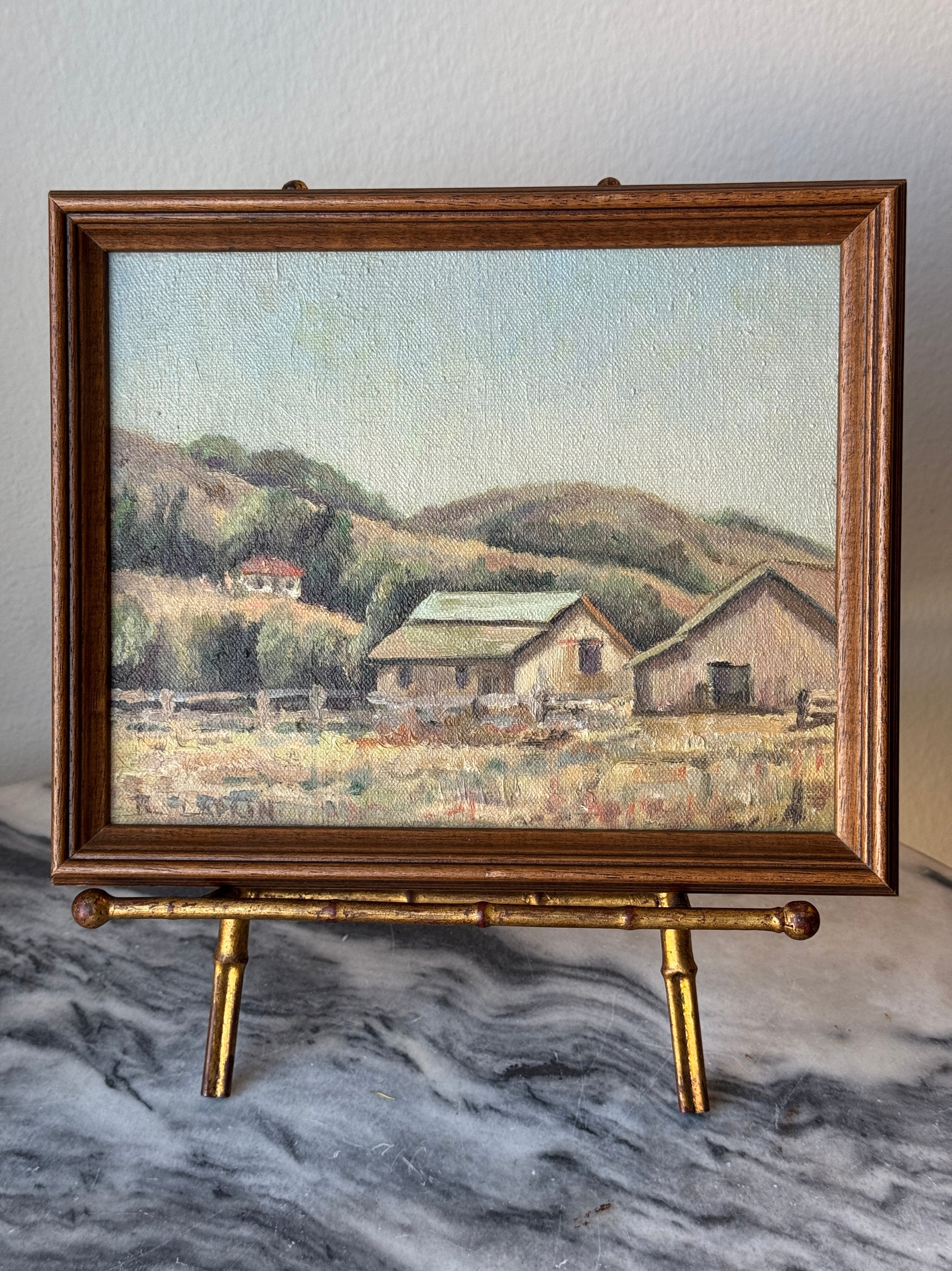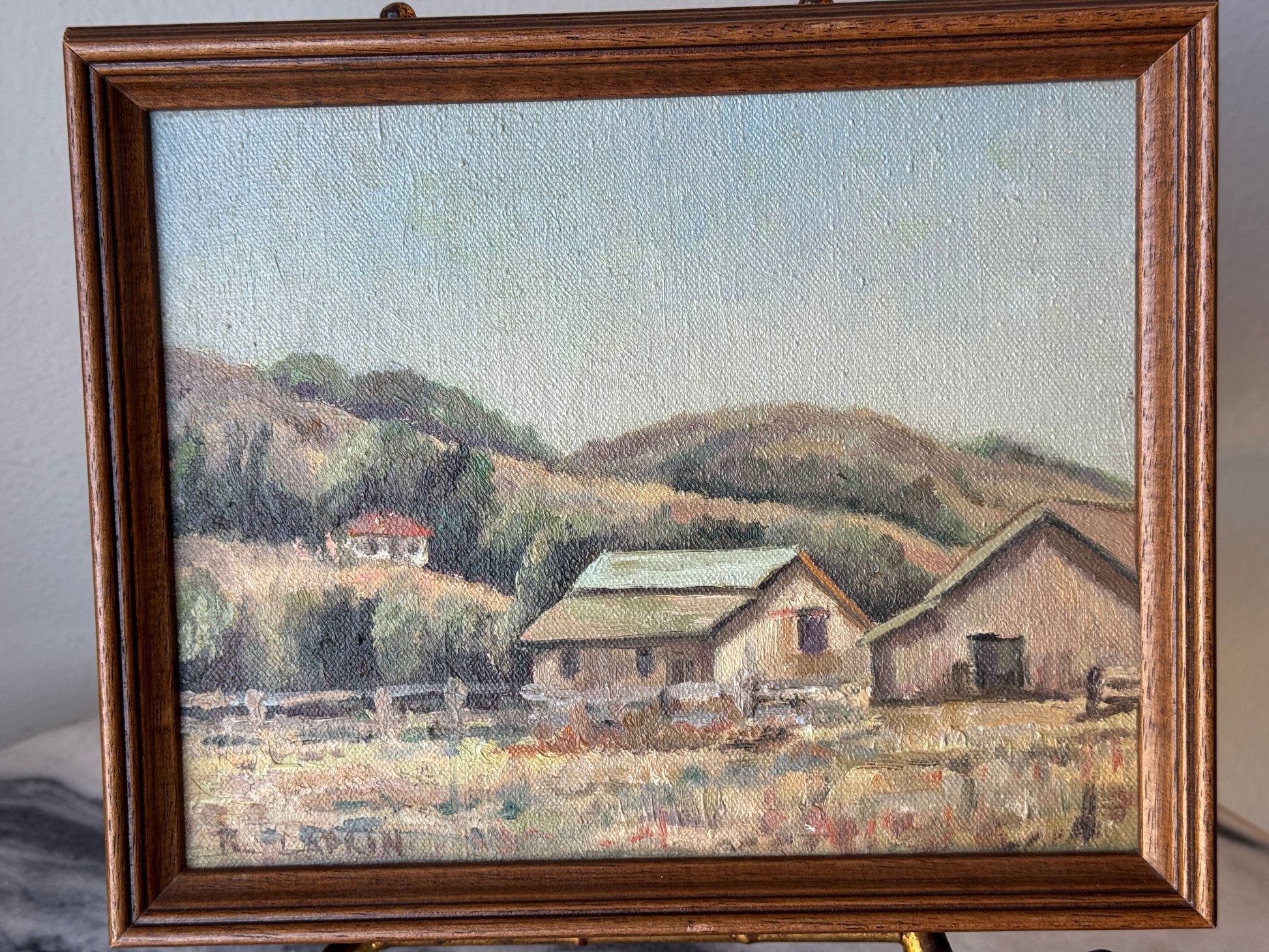 Vintage Plein Air Landscape Painting – Rustic Farm Scene by R. Larson – California Impressionist Style Oil on Board
