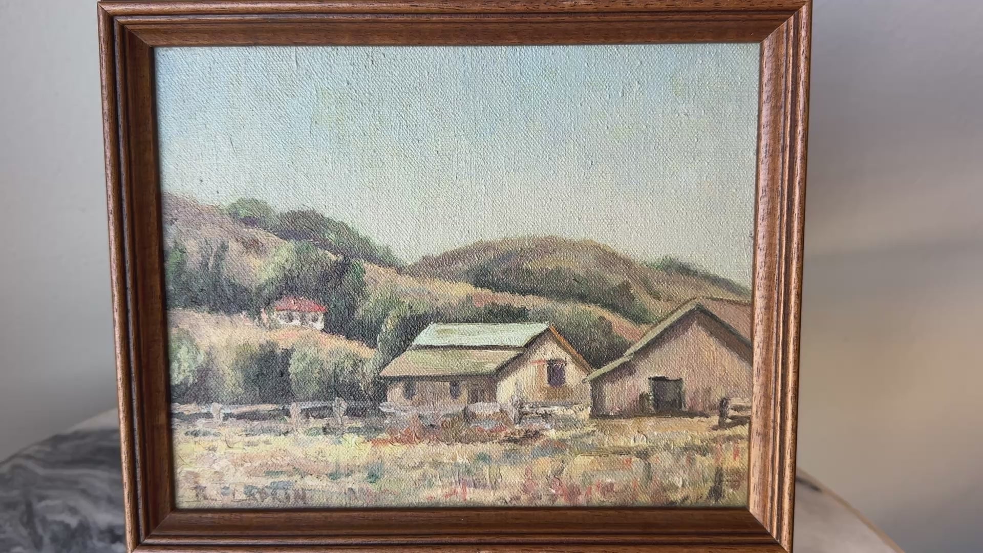 vintage landscape painting, plein air oil painting, rustic farmhouse art, California impressionist painting, signed midcentury art, R. Larson artist, oil painting on board, cottagecore wall art, American plein air, antique rural art, pastoral wall decor
